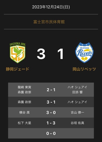 ノジマTリーグの2023-2024シーズンの公式戦で、12月24日に行われた「静岡ジェード vs 岡山リベッツ」の試合は、静岡ジェードが3-1で勝利しました。