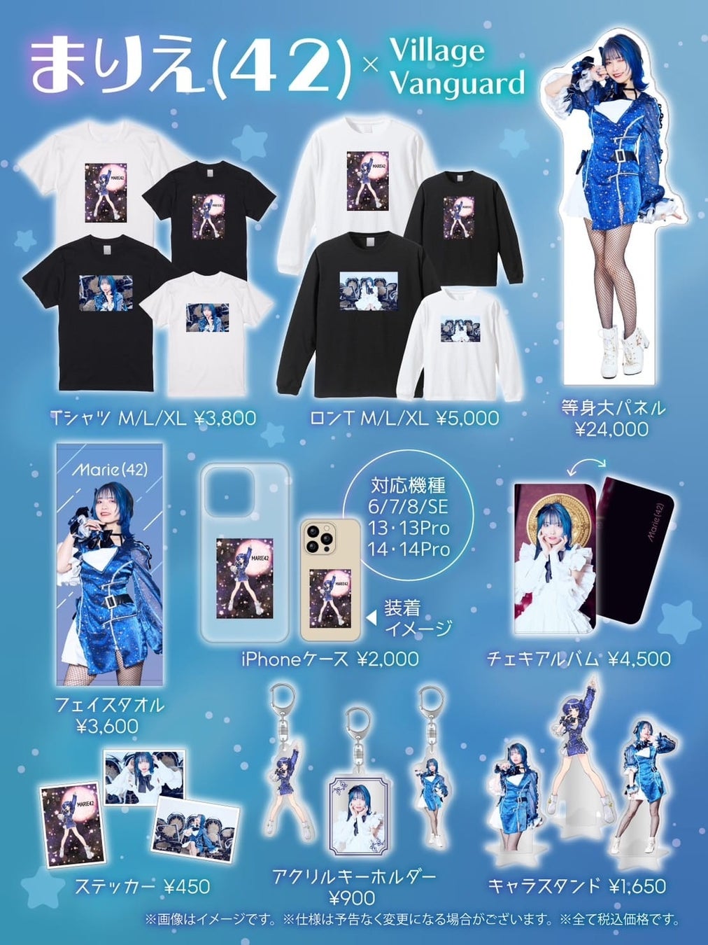 TシャツやロンT、iPhoneケース、ステッカー、チェキアルバム、フェイスタオル、アクリルキーホルダー、キャラスタンド、等身大パネルなど、様々なアイテムが用意されています。