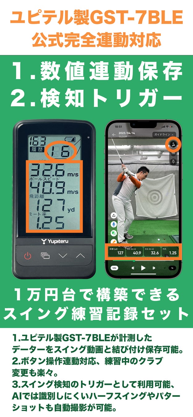 - 2. ユピテル制飛距離計測器GST7BLEとの連動機能を強化し、小ぶりスイングやパターの動作も録画可能に。