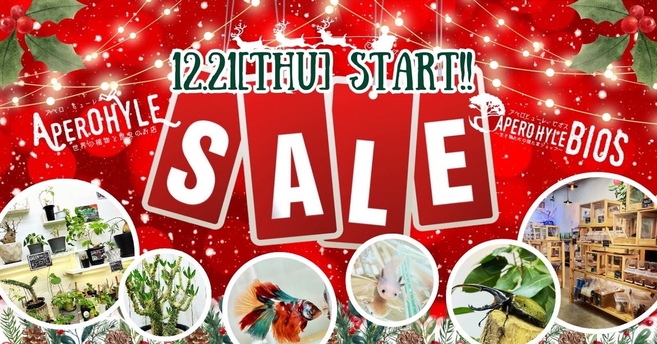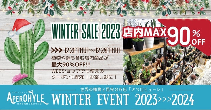 アペロ・ヒューレとアペロヒューレ・ビオスでは、ウィンターセールが開催されます!アペロ・ヒューレでは、植物や鉢が最大90%OFFで購入できます。