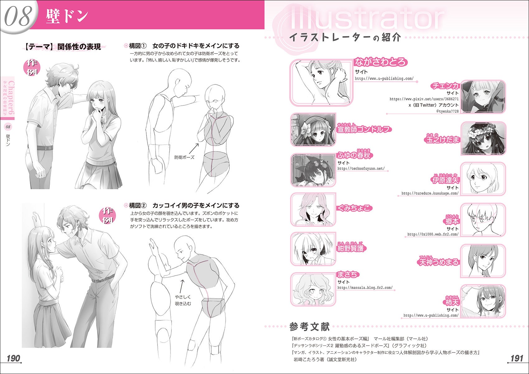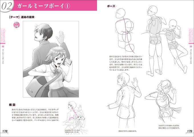 さらに、第6章では少女漫画の恋愛描写に焦点を当て、2人の関係性や複雑なポーズの描き方を紹介しています。