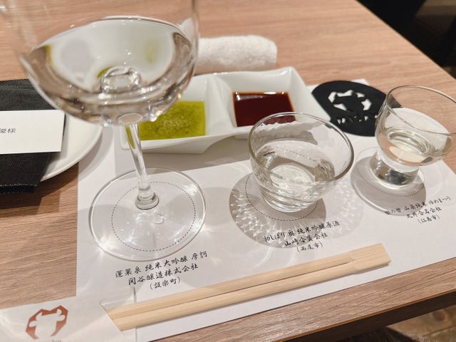 愛知県の地酒三種類をセレクトし、お客様はそれぞれのお酒と料理のペアリングを楽しんでいました。