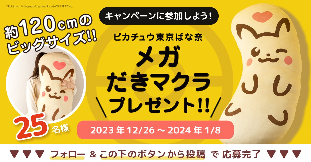 - 25名様に約120㎝の「ピカチュウ東京ばな奈メガだきマクラ」がプレゼント