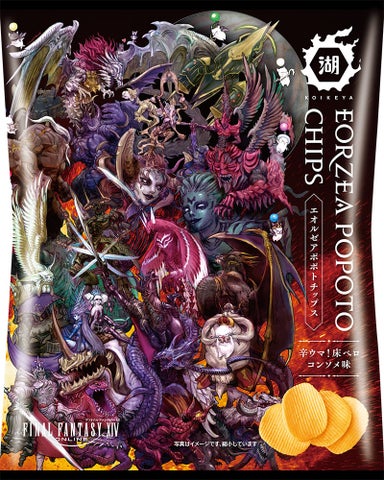 パッケージには湖池屋のロゴとファイナルファンタジーXIVのボスキャラクターのアートが使用されています。