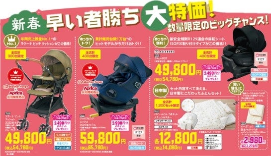 【2024年 初売】数量限定のお買い得企画が開催されます!ベビーカー「ラクーナ ビッテクッション2022年モデル」やチャイルドシート「クルリラビッテ エックス2022年モデル」などが大特価に!さらに、ベビーふとん7点セットや人気のおもちゃもお得です。