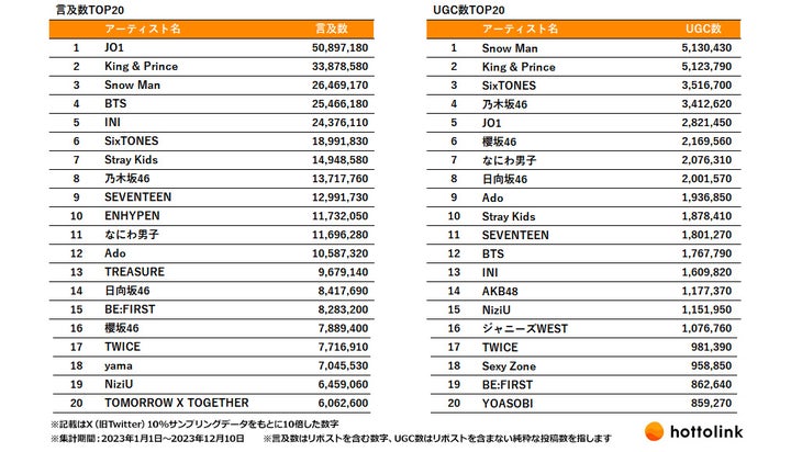 調査結果によれば、言及数のTOP3はJO1、King & Prince、Snow Manであり、UGC数のTOP3はSnow Man、King & Prince、SixTONESでした。