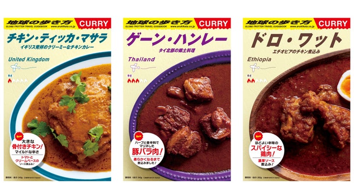 第一弾はイギリスの「チキン・ティッカ・マサラ」、タイの「ゲーン・ハンレー」、エチオピアの「ドロ・ワット」の3種類です。