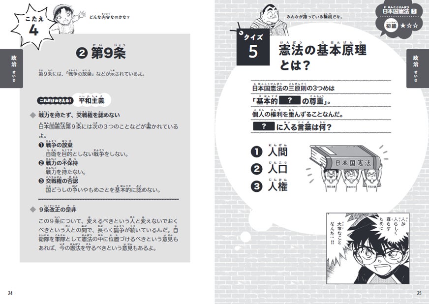 『名探偵コナンの10才までに知っておきたい世の中のこと177』では、政治・経済・社会・国際のニュースに関する楽しいクイズが177本あります。