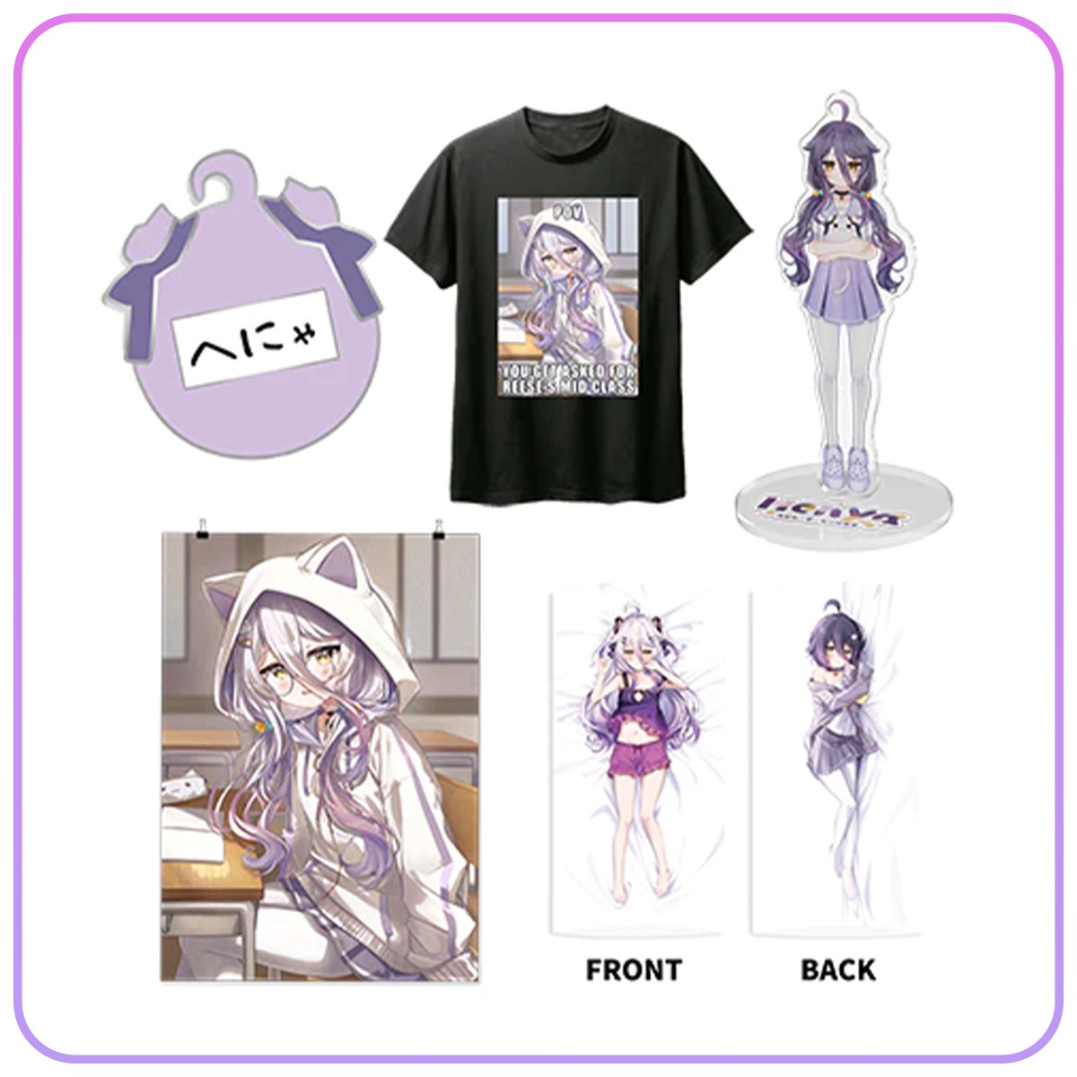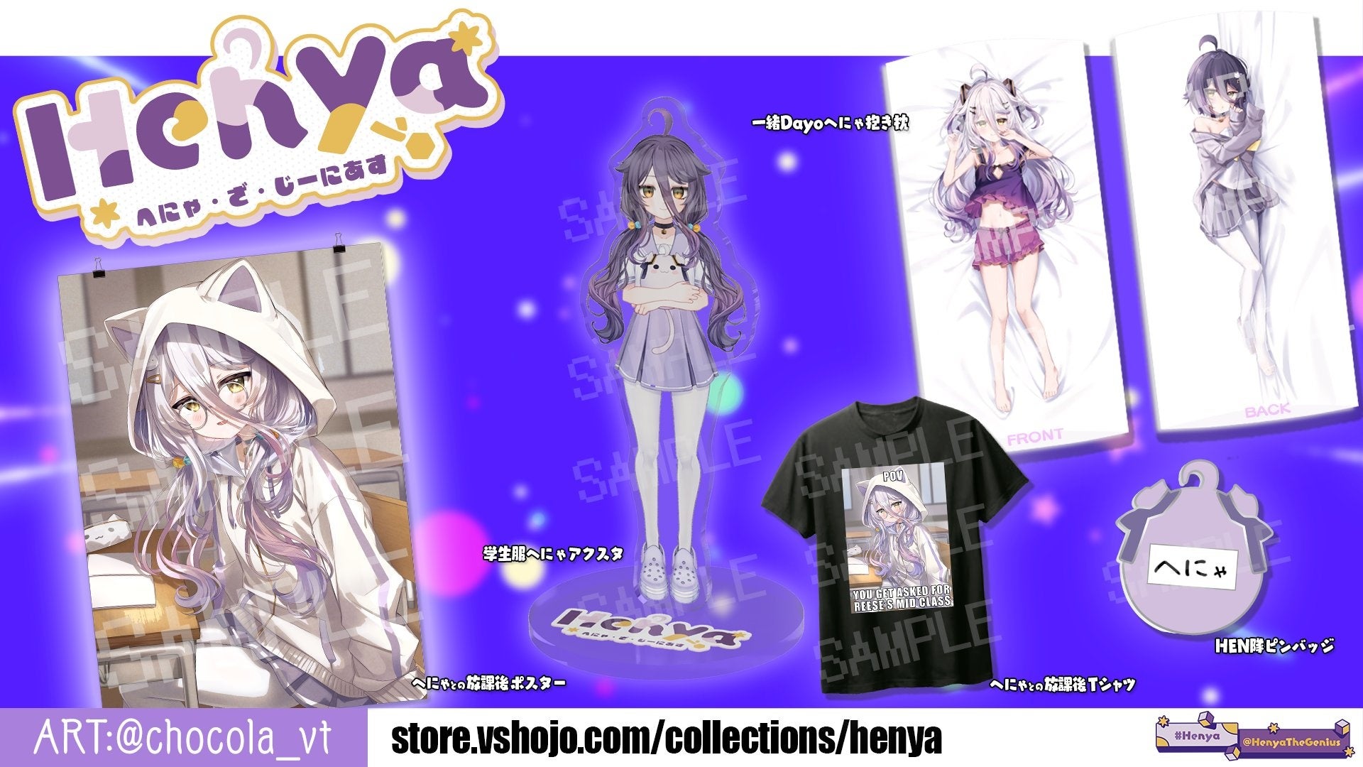 - Henyaのグッズのラインナップには、抱き枕、ピンバッジ、アクリルスタンド、Tシャツ、ポスターなどがある。