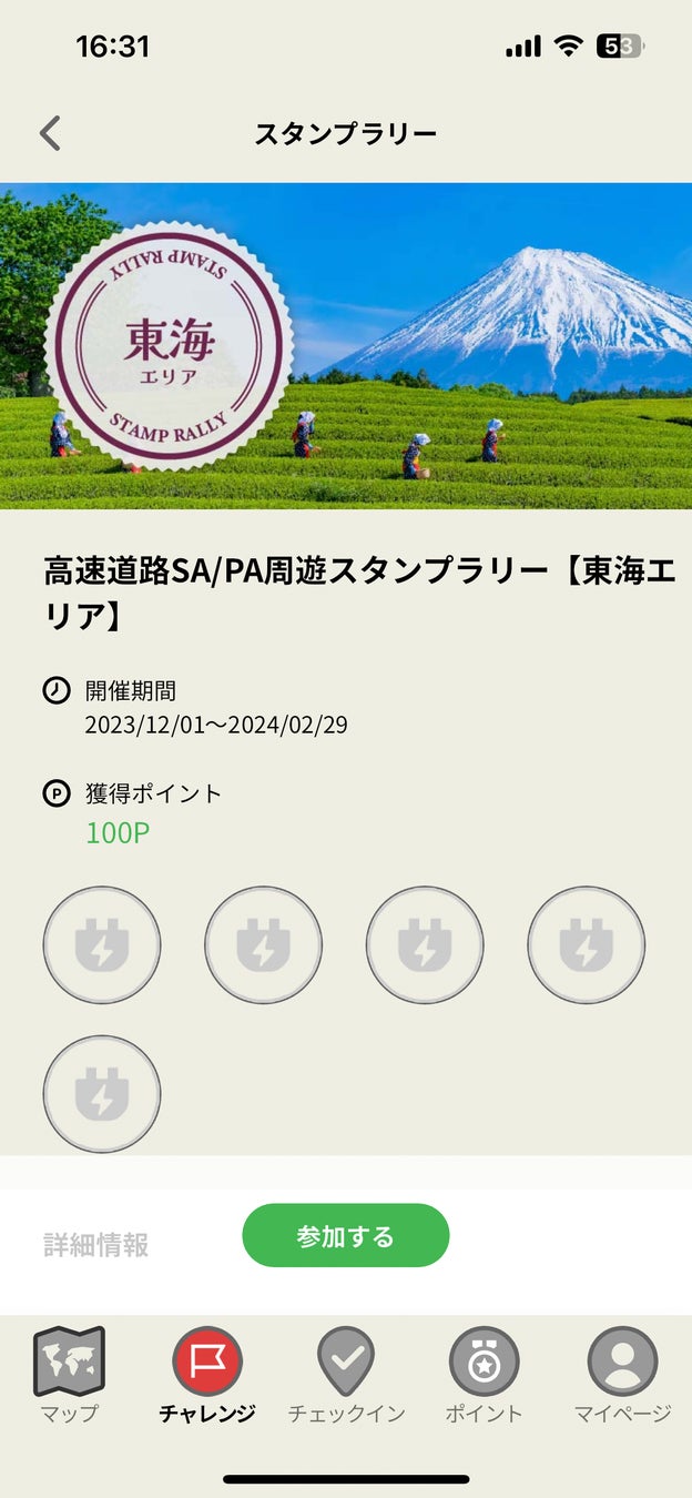 - 指定されたEV充電器でチェックインするとスタンプ獲得
