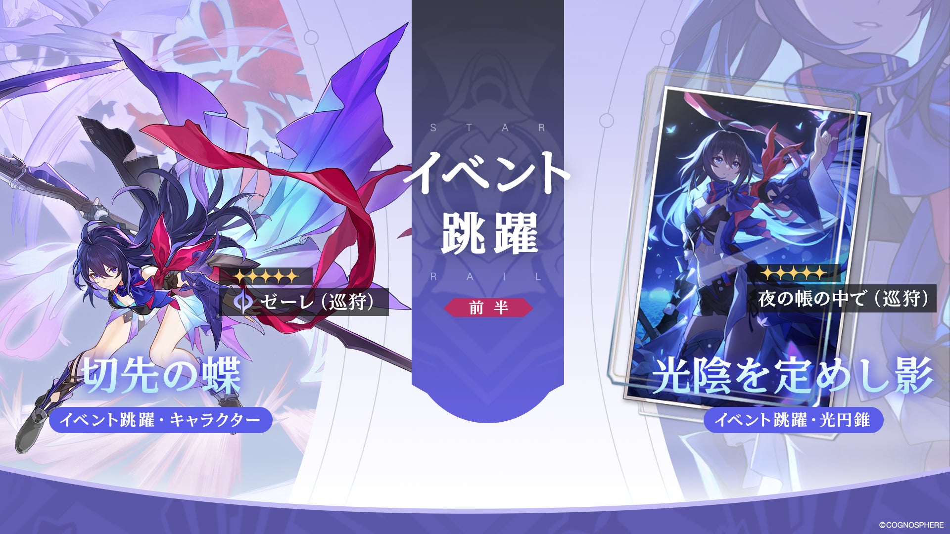 前半には「切先の蝶」で星5キャラクター「ゼーレ」、「光陰を定めし影」で星5光円錐「夜の帳の中で」の出現率がアップします。