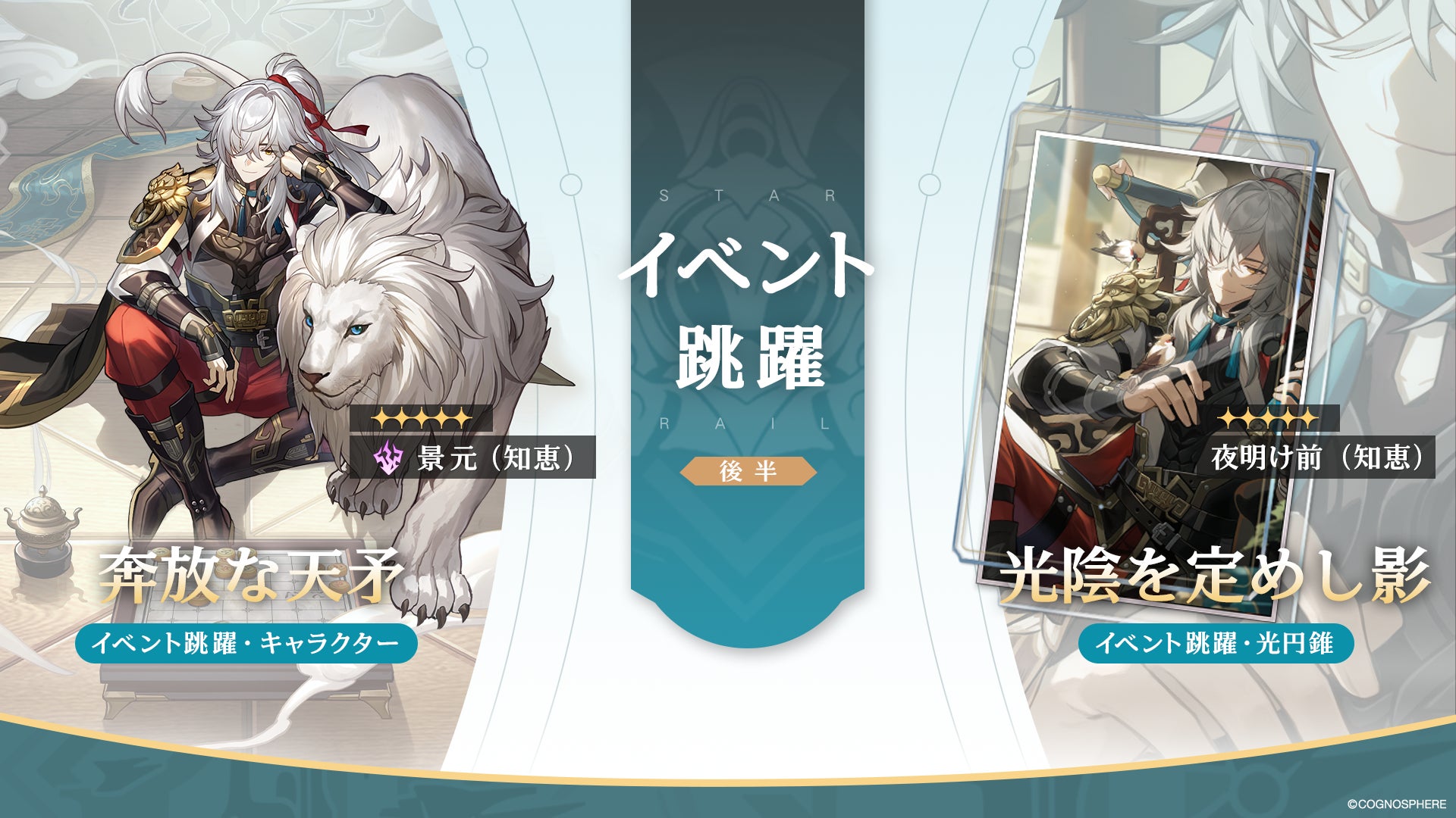 後半には、イベント跳躍「奔放な天矛」で星5キャラクター「景元」、「光陰を定めし影」で星5光円錐「夜明け前」の出現率がアップします。