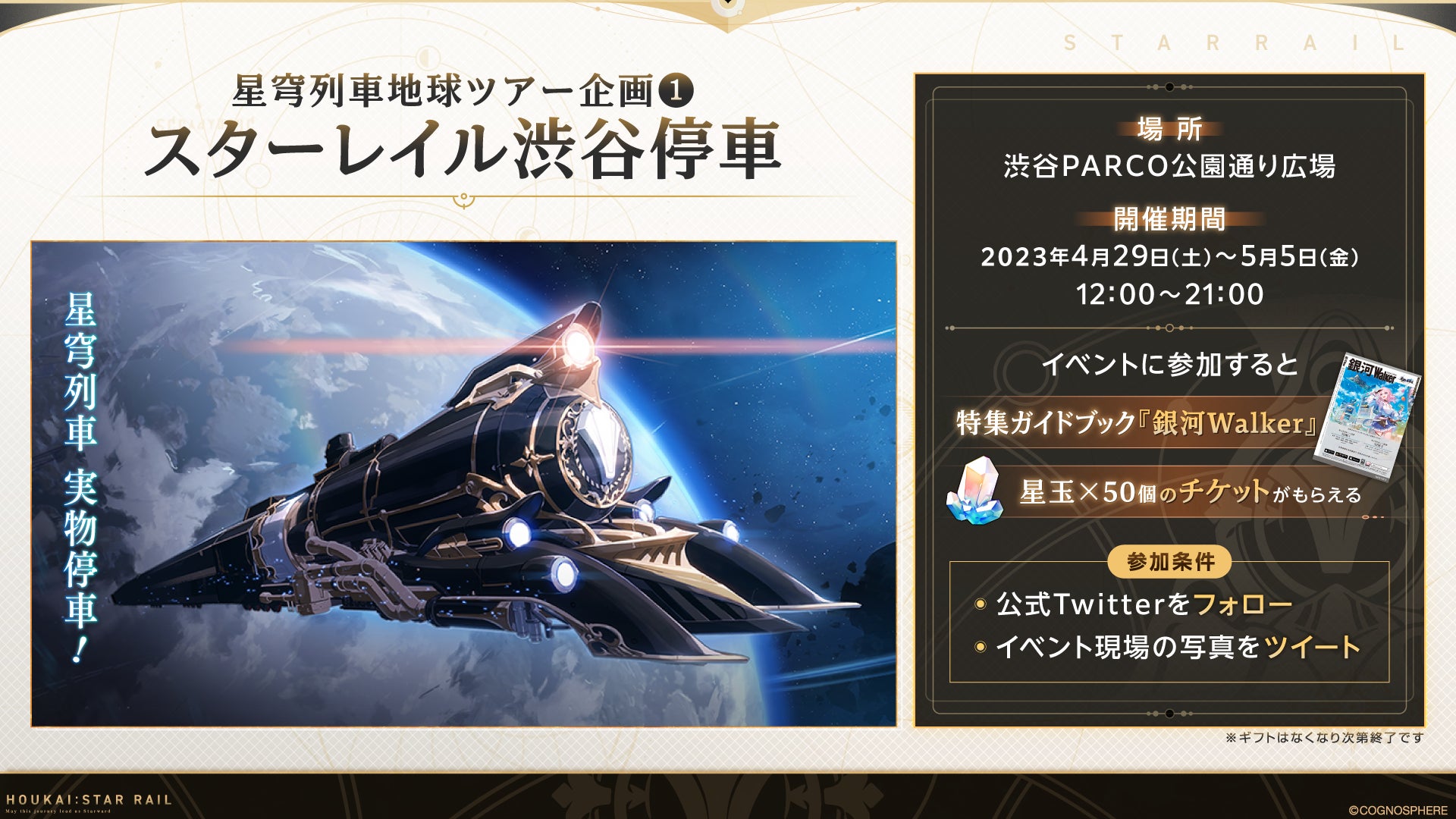 実物の星穹列車が渋谷PARCOに停車するイベント「スターレイル渋谷停車」は2023年4月29日(土)から5月5日(金)までに開催します。イベント参加で星玉×50と交換できるギフトと限定ガイドブック「銀河Walker」を獲得できます。
