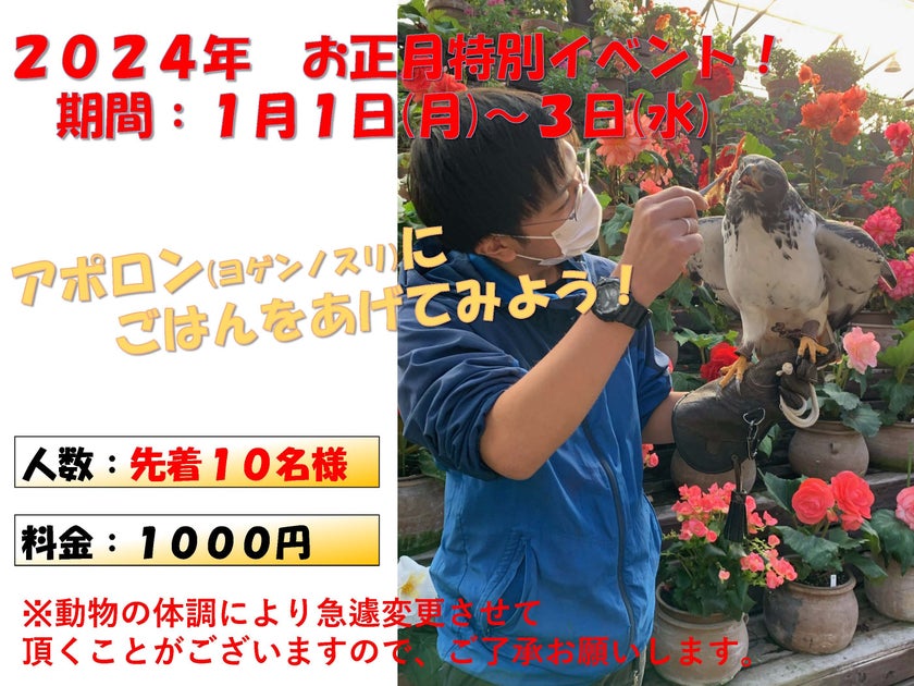 富士花鳥園ではお正月特別イベント「ヨゲンノスリのアポロンにごはんをあげてみよう!」が開催されます。