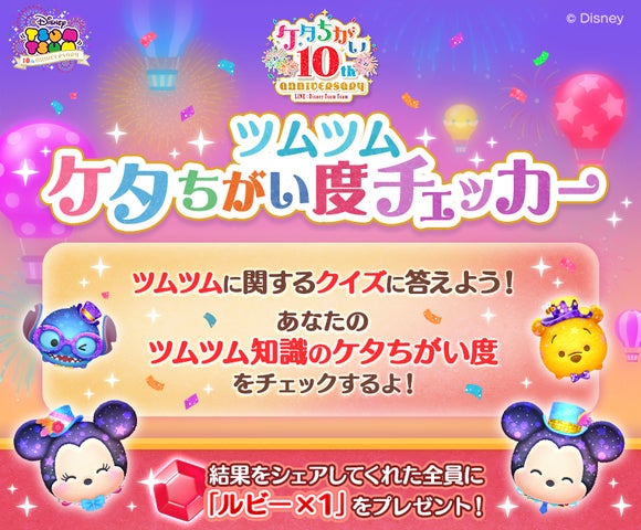 さらに、10周年記念ツム「フェスティバルミッキー」と「フェスティバルミニー」が登場し、特設サイトではクイズに答えてツムツムの知識をチェックするキャンペーンも開催されます。