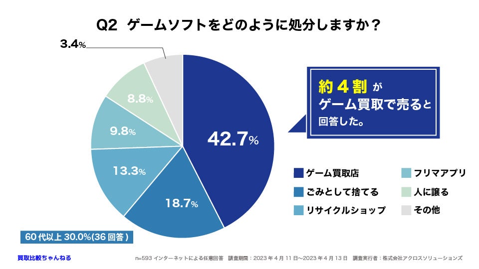 Q2 ゲームソフトの処分方法に「ゲーム買取店」を利用すると答えた人が42.7%だった。ただし60代以上では「ごみとして捨てる」(30%)と回答した人が「ゲーム買取店」(27.5%)と回答した人を上回った。