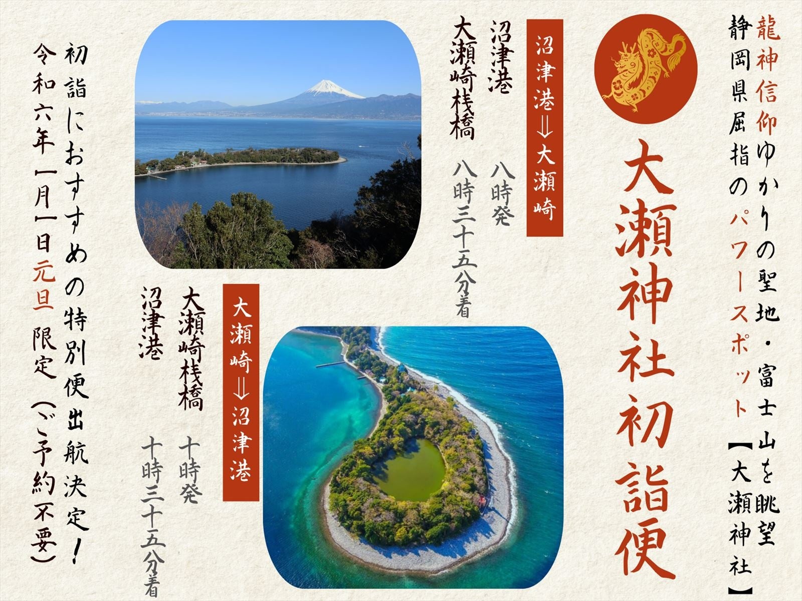 - 千鳥観光汽船が2024年元旦に大瀬神社初詣特別クルーズ便を運航する。