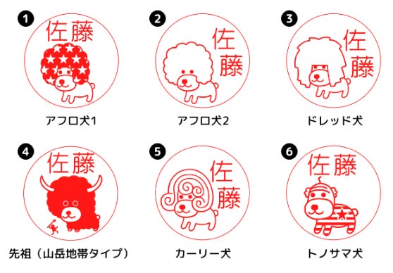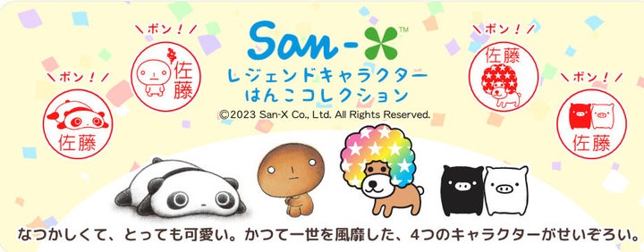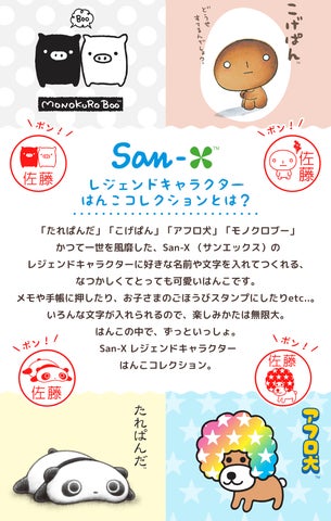 このコレクションでは、1990年代から2000年代に人気を博したSan-Xのキャラクター「たれぱんだ」「こげぱん」「アフロ犬」「モノクロブー」のかわいいイラストを使って、自分の好きな名前や文字を入れたオリジナルのはんこを作ることができます。