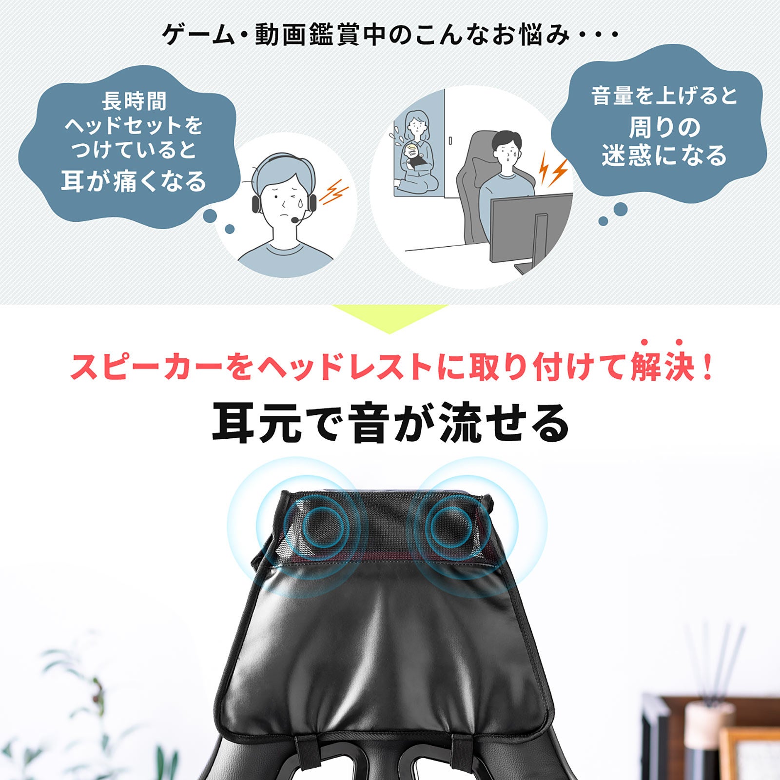 スピーカーを後付けすることで、臨場感が増し、流す音源を変えることで、ゲーミングチェアやリラックスチェア、眠れるチェアと使い分けができる。
