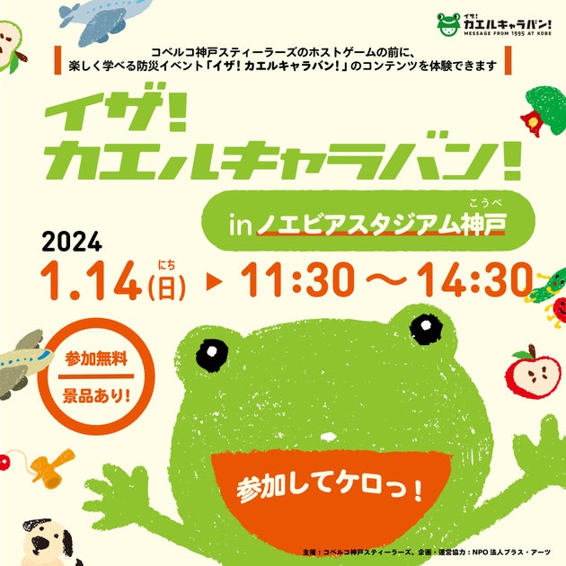 このイベントでは、NPO法人プラス・アーツの協力の下、楽しみながら防災訓練イベント「イザ!カエルキャラバン! Inノエビアスタジアム神戸」も行われます。