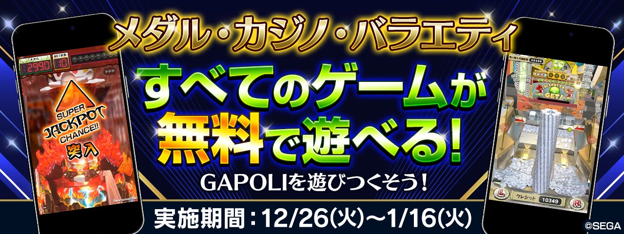次世代型オンラインゲームセンター『GAPOLI』では、期間中、メダルカテゴリ、カジノカテゴリ、バラエティカテゴリの全ゲームが無料で楽しめます。