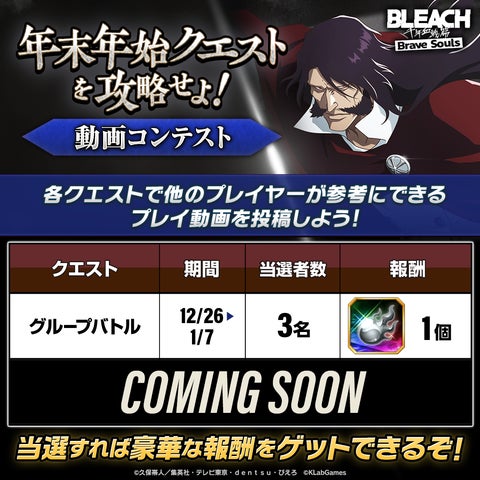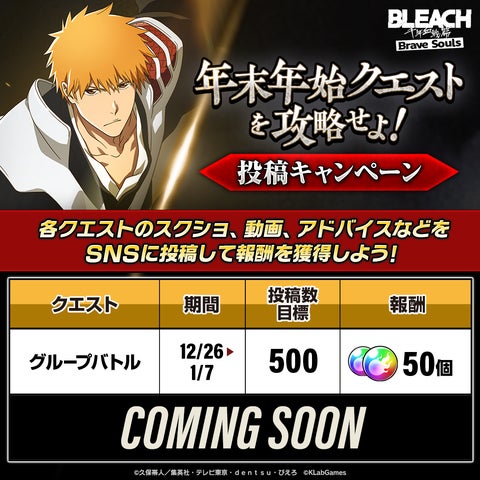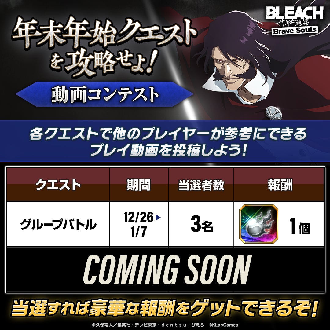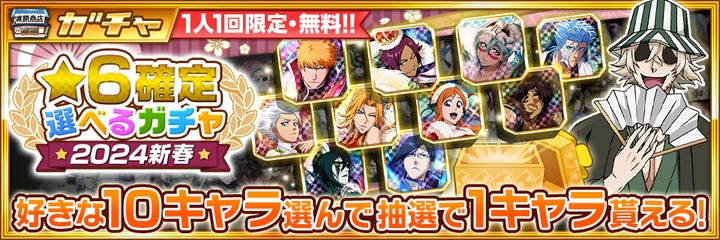- 新春特別・千年血戦篇プライズガチャ、2024新春★6確定選べるガチャ、新春特別ログインボーナス、年末年始プレゼント、参加型SNS投稿キャンペーン