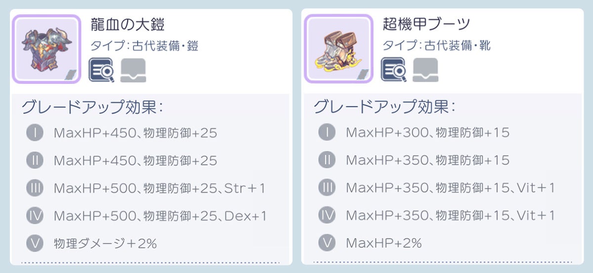鎧・靴の魔力注入装備や古代装備をランクVにアップグレードすることが可能です。
