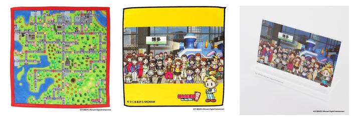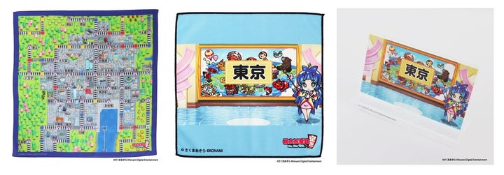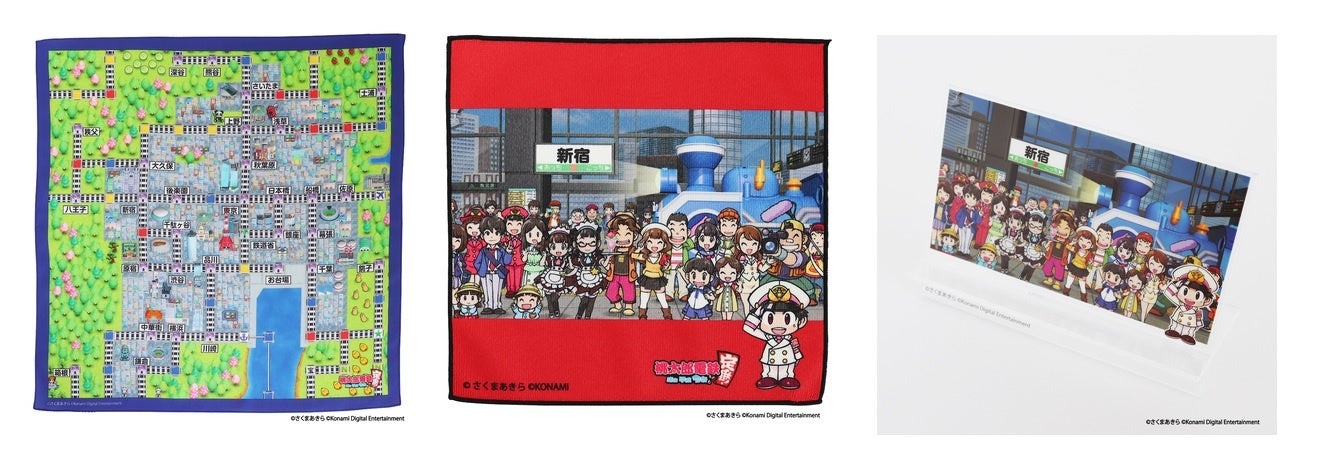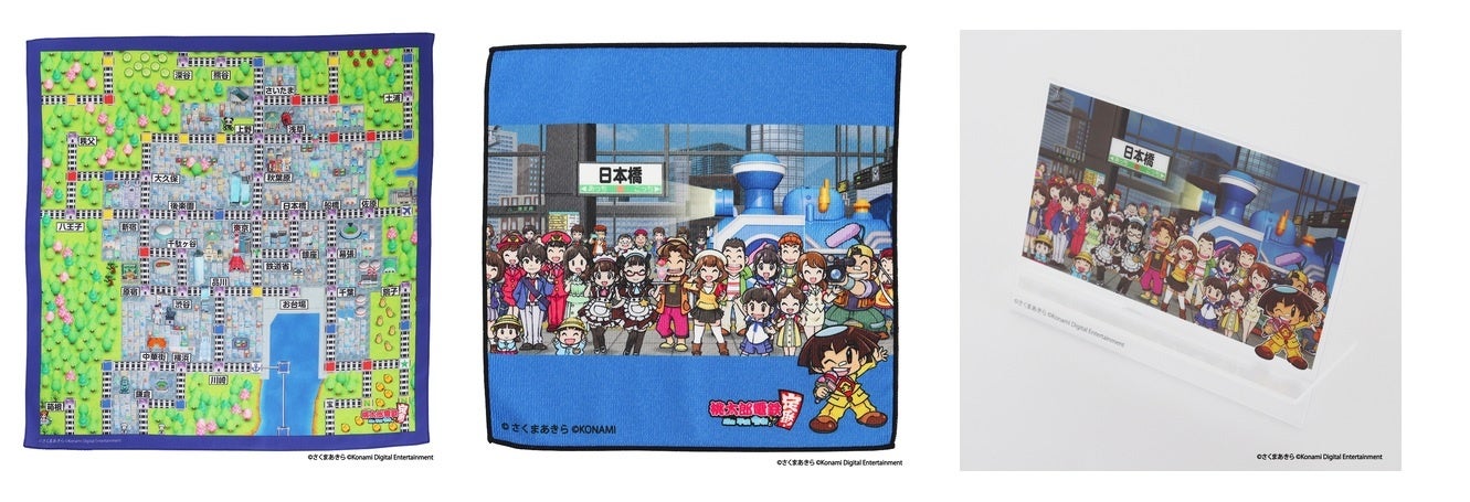 • ハンカチやスマホ拭き、アクリルスタンドなど、ゲームのキャラクターや路線図柄がプリントされた商品があり、先行販売柄もある