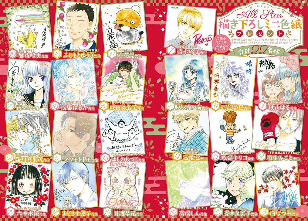 読者プレゼントとして、先生方の描き下ろしミニ色紙がプレゼントされますので、ぜひ応募してみてください。