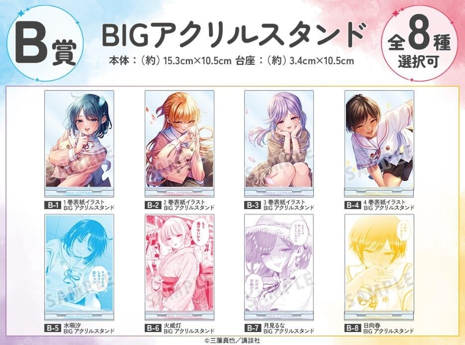 - キャンバスボード、BIGアクリルスタンド、A3マット加工ポスター、アクリルキーホルダー、缶バッジ、特典ブロマイド