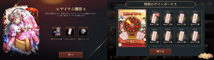 イベント期間中は、おみくじ券を集めてルーレットを回すことができ、さまざまなアイテムや新キャラクター「氷川 継嗣:お正月ver」を手に入れることができます。