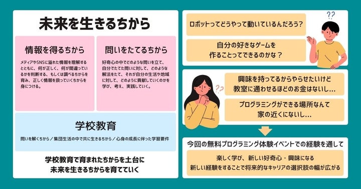 多くの親が幼少期からプログラミングに触れさせたいと思っていますが、金銭的な余裕や近くに教室がないという理由で機会が限られています。