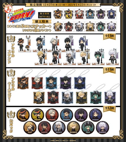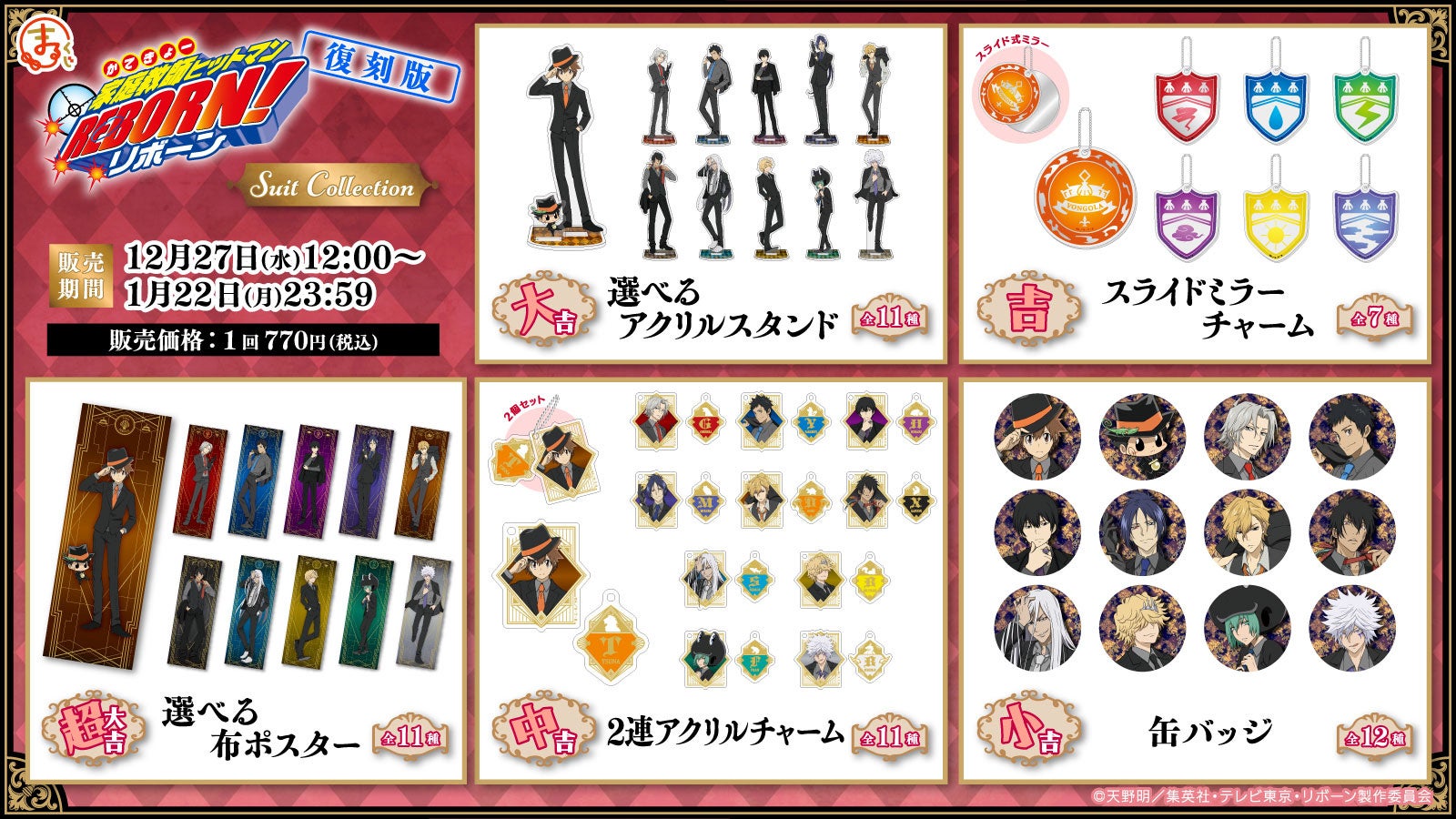 TVアニメ『家庭教師ヒットマンREBORN!』が『まるくじ』に再登場します!第二弾では、「スーツ姿」のかわいいキャラクターイラストを使用したアイテムが登場します。