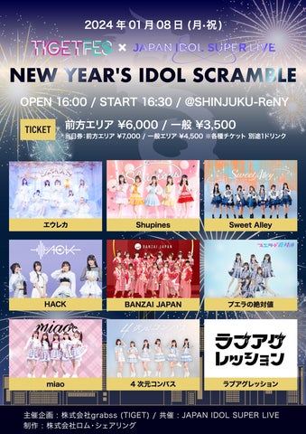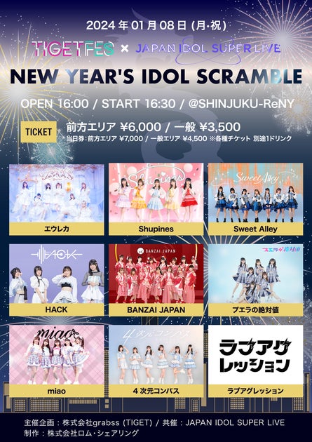 2024年1月8日には、新宿ReNYで開催される「NEW YEAR’S IDOL SCRAMBLE Produced by TIGET FES & SUPER LIVE」のチケットが、イベントプラットフォーム「TIGET」で販売中です。