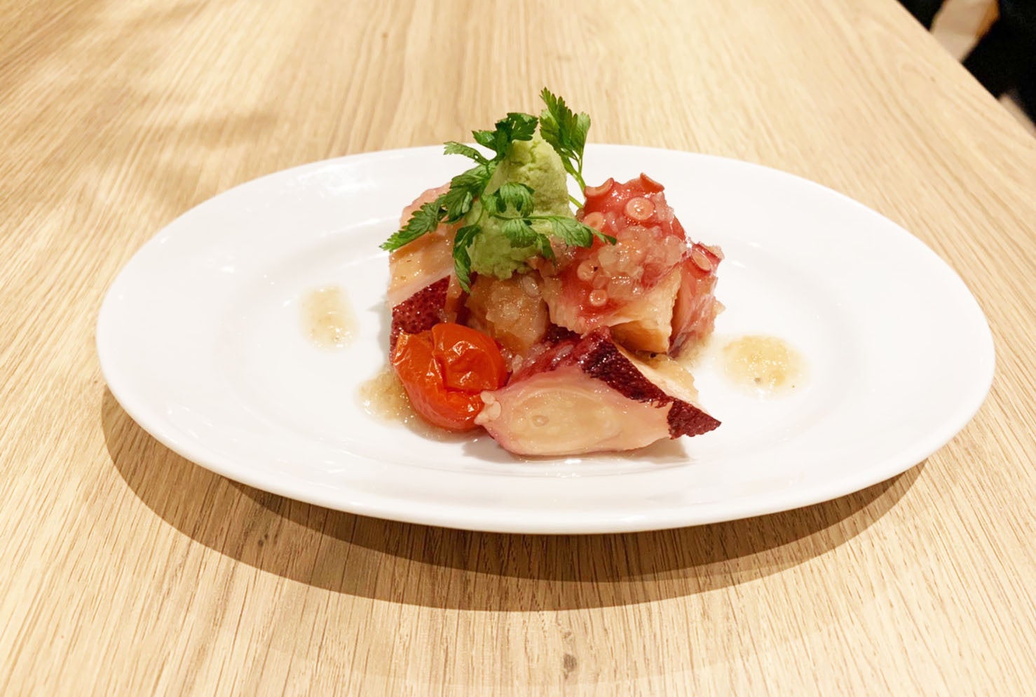 - 三元豚の小悪魔焼き、生ハムのシーザーサラダ、前菜の盛り合わせ、スモークサーモンのカルパッチョ