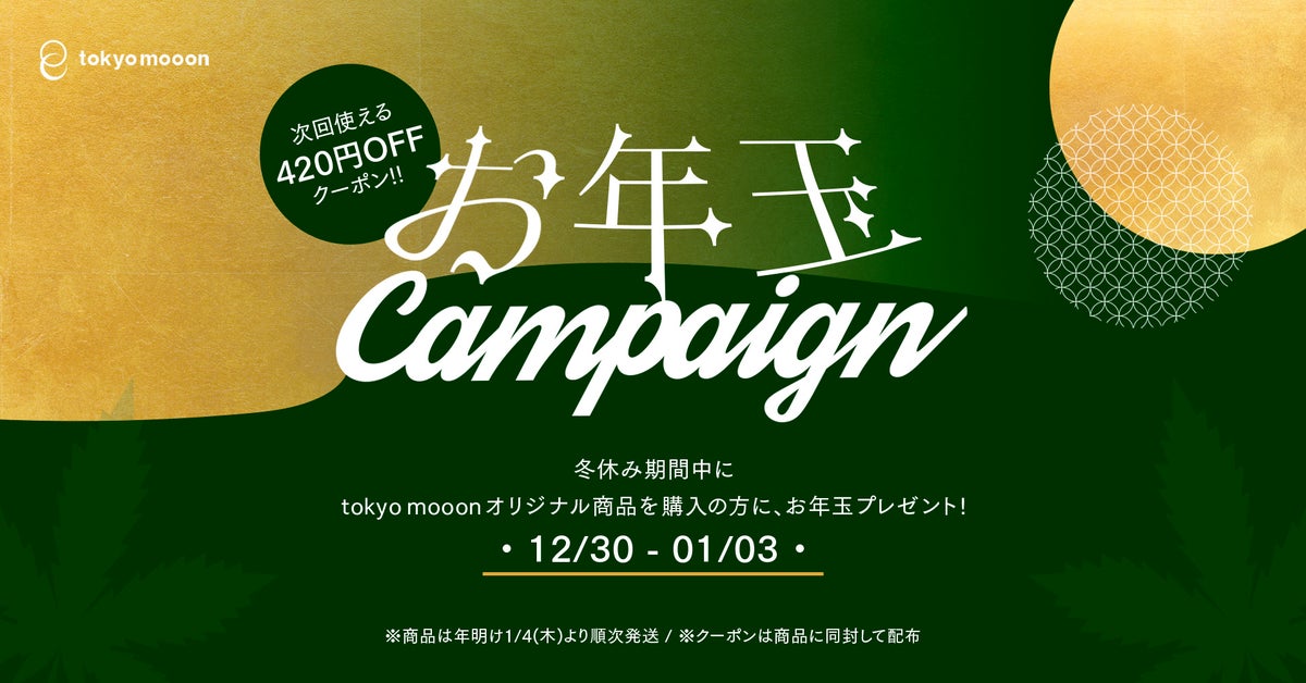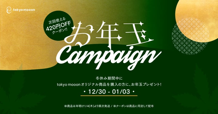 - キャンペーン期間中にtokyo mooon商品を購入すると、お年玉クーポン420円分プレゼント