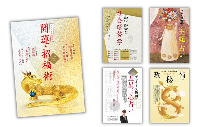 山口知宏の社会運勢学、ともこ式数秘術、ステラ薫子の「王妃」占い、ゲッターズ飯田の五星三心占い、CHIE&縁ちえの東京開運散歩など、開運・招福術の情報を収録しています。