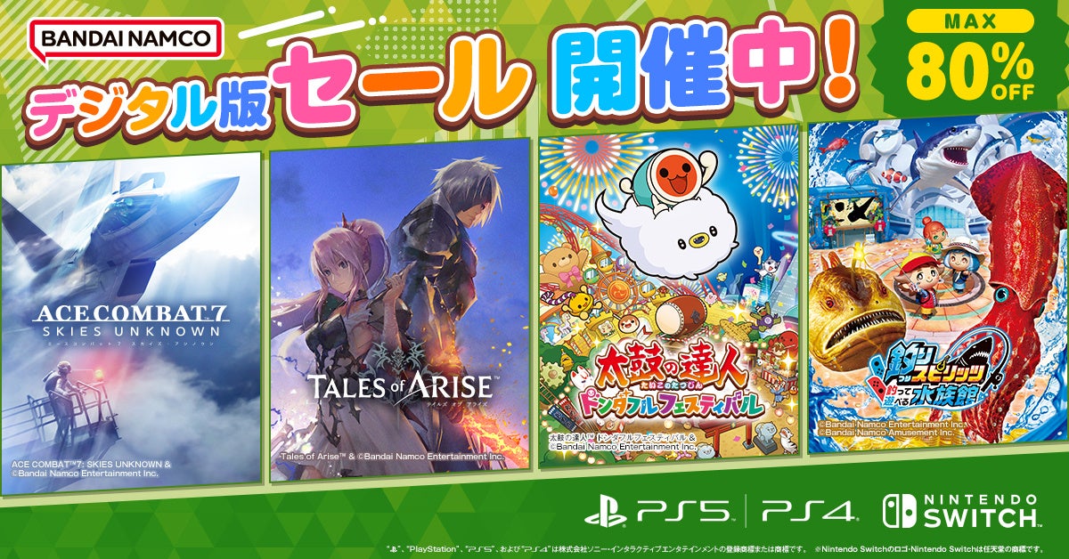 バンダイナムコエンターテインメントが、PlayStationやNintendo Switchでダウンロード版ゲームが最大80%OFFのセールを開催中。