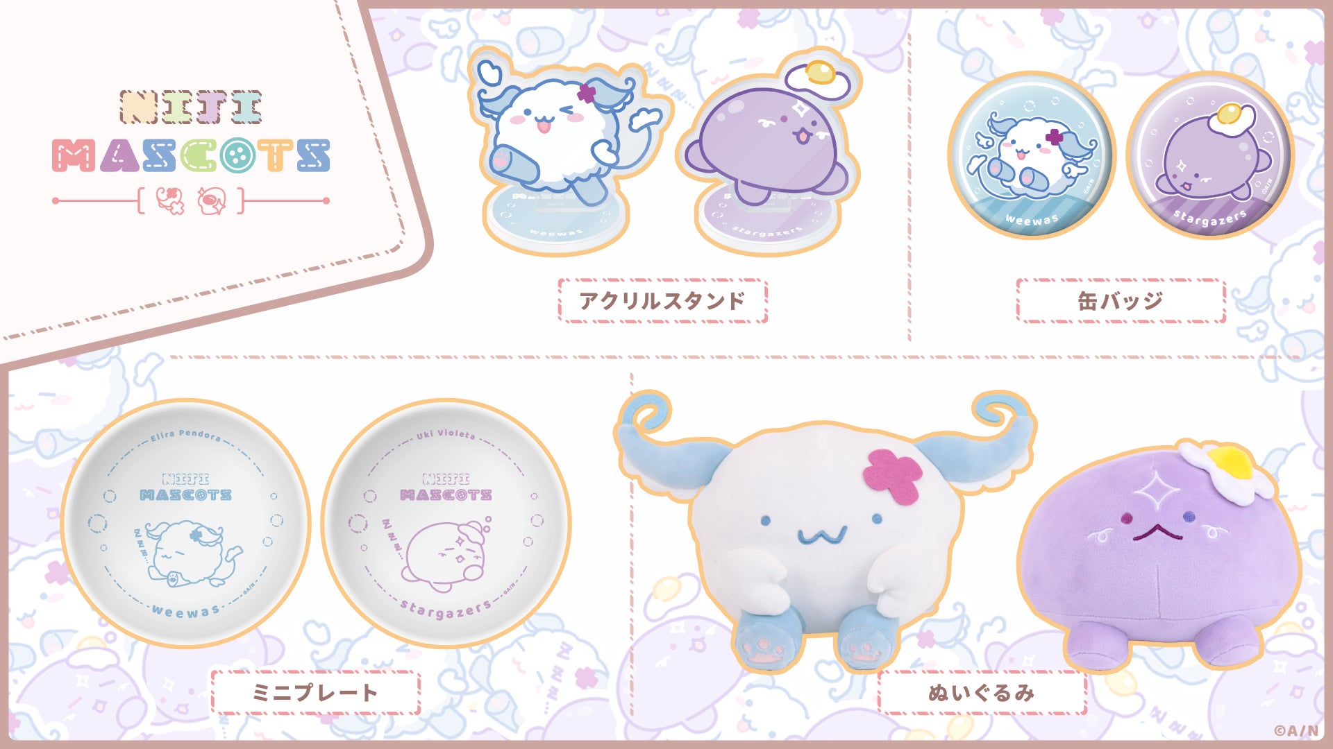 - NIJI Mascots、アクリルスタンド、缶バッジ、ミニプレート、ぬいぐるみ