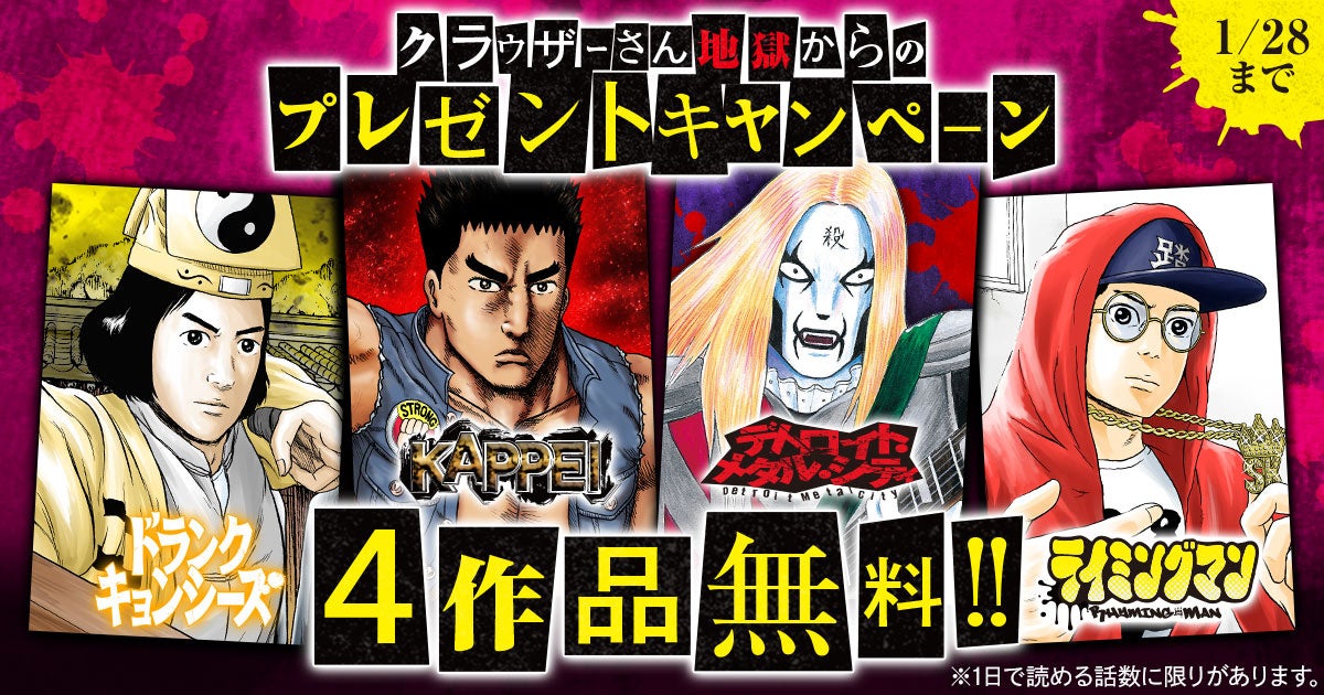 ヤングアニマルWebでは、人気作品「デトロイト・メタル・シティ」「KAPPEI」「ライミングマン」「ドランクキョンシーズ」を同時に掲載しています。