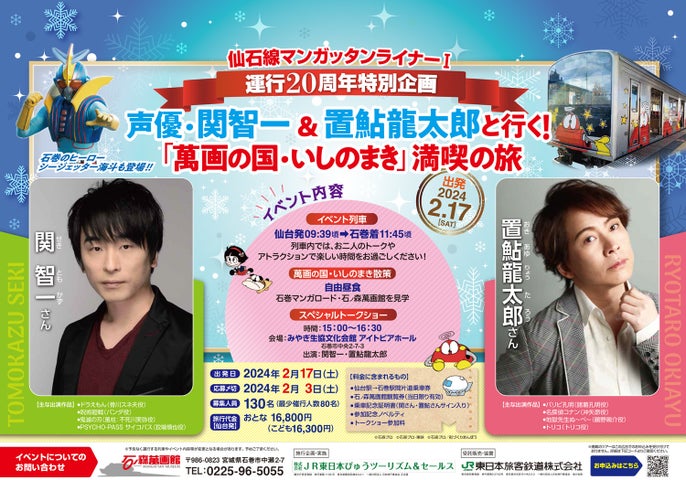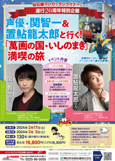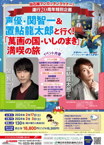 - 関智一さんと置鮎龍太郎さんによるイベントでは、車内イベントや陸前小野駅でのおたのしみイベント、石巻駅での「シージェッター海斗」たちによるお出迎えなどが予定されています。