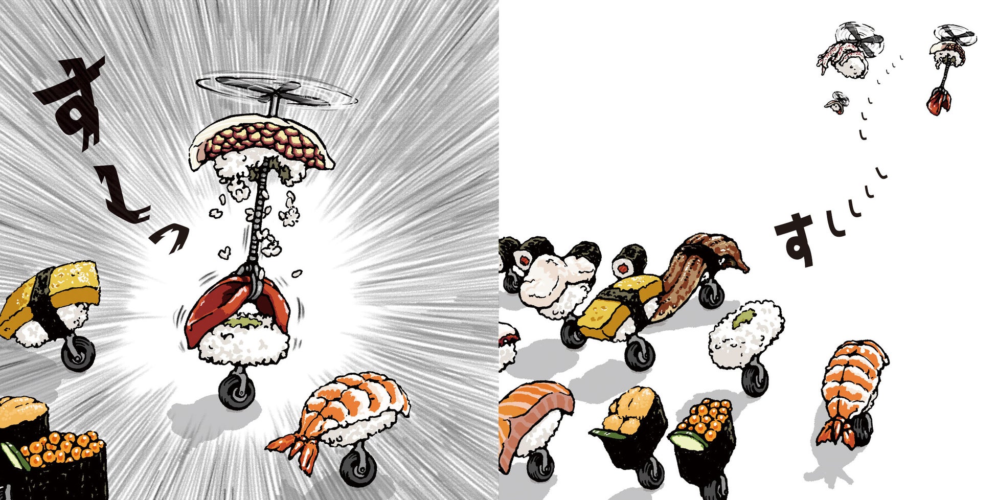 - 謎のすし達が絵本の中で駆け抜ける様子が描かれる