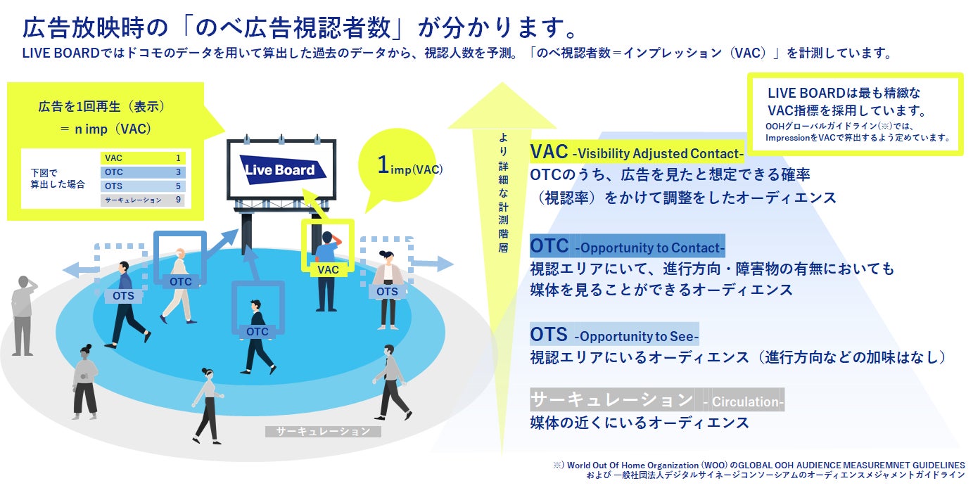 LIVE BOARDは、視認率を考慮したインプレッション(VAC)を使用し、広告の視認者数を推定しています。
