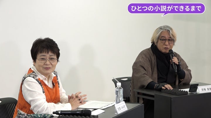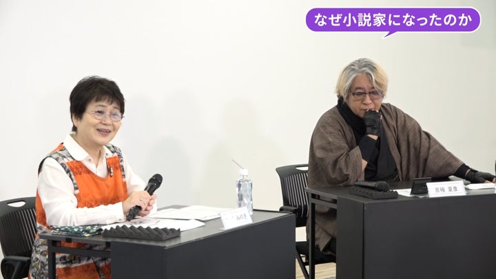 宮部先生は速記者から作家になるまでの経験を、京極先生はデザインから小説家になるまでの経緯を語りました。