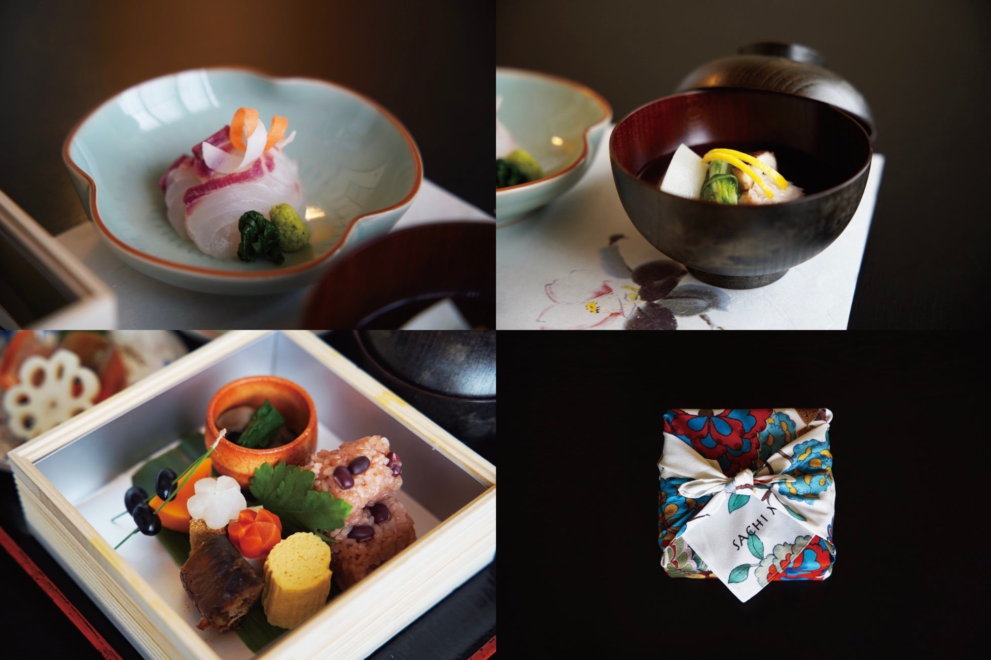 食事には京都の窯元の器や漆屋の汁椀が使用され、お弁当箱は組紐で結ばれ、手描友禅作家による風呂敷で包まれます。