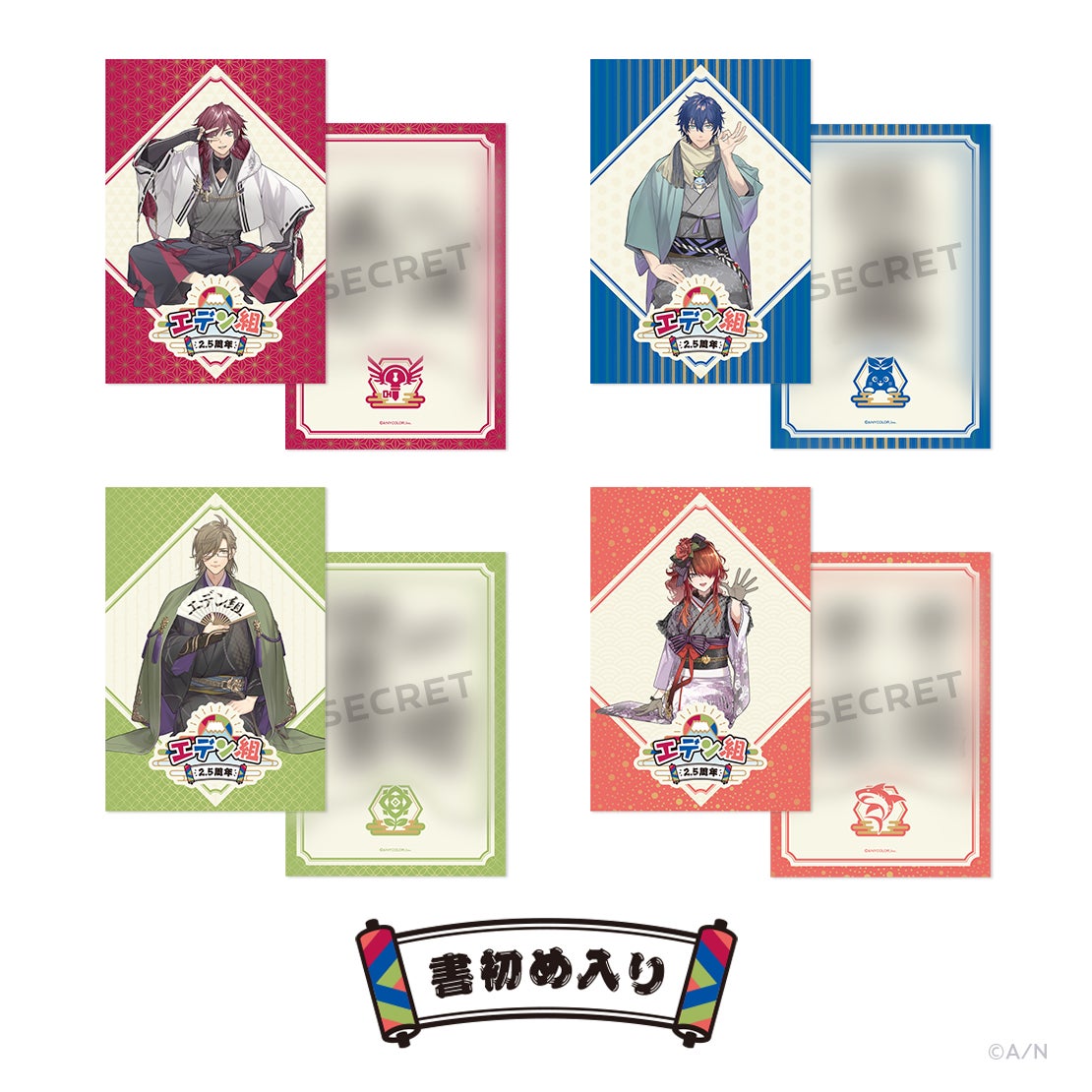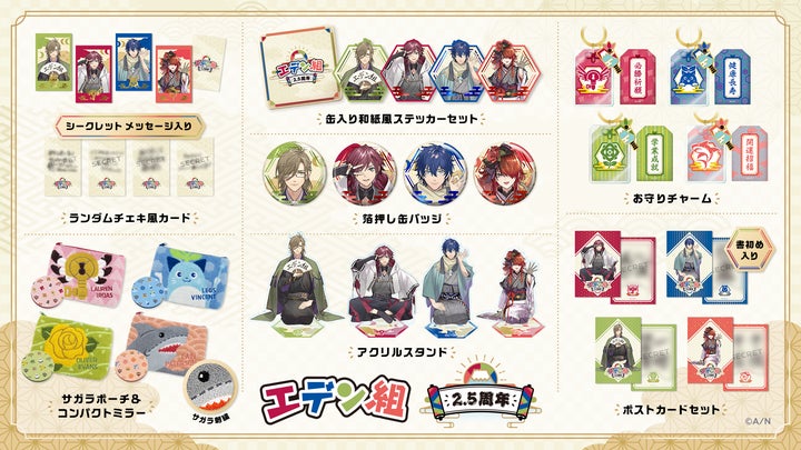 バーチャルライバーグループ「にじさんじ」のユニット「エデン組」が2.5周年を迎え、記念グッズが登場します!アクリルスタンド、ランダムチェキ風カード、箔押し缶バッジ、缶入り和紙風ステッカーセット、ポストカードセット、お守りチャーム、サガラポーチ&コンパクトミラーの7種類がラインナップされています。