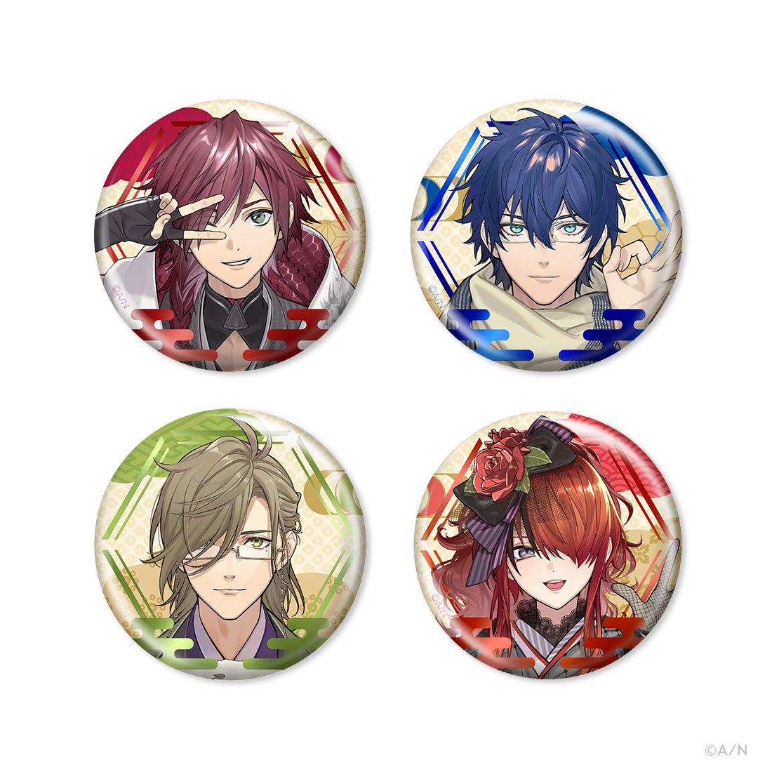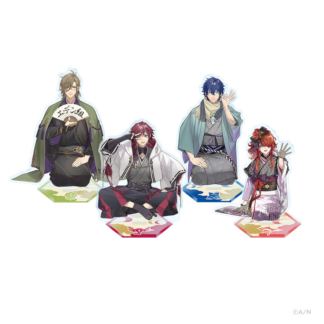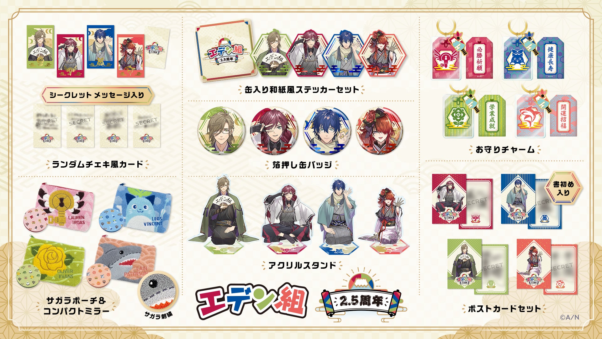 - アクリルスタンド、ランダムチェキ風カード、箔押し缶バッジ、缶入り和紙風ステッカーセット、ポストカードセット、お守りチャーム、サガラポーチ&コンパクトミラー