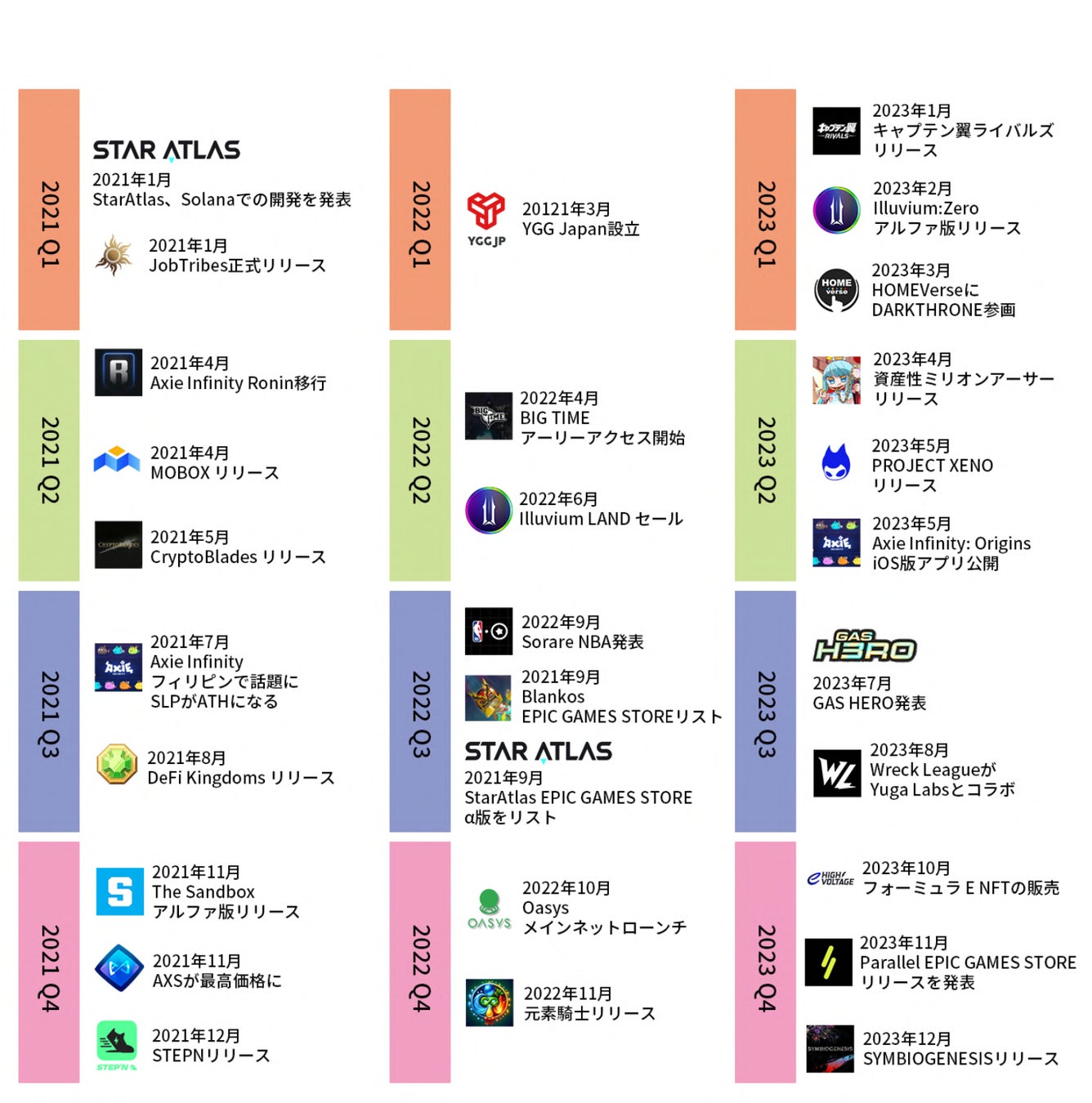 また、ブロックチェーンゲームの年表では、2017年のCryptoKittiesから2023年のBIG TIMEやPROJECT XENOまでのゲームが一覧できます。