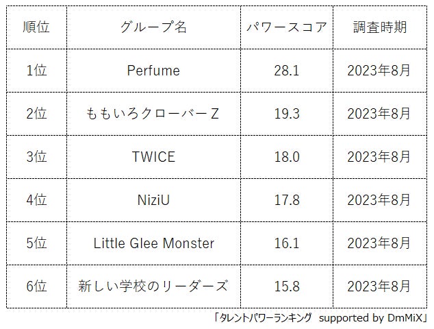 タレントパワーランキングに登録されている女性音楽グループのパワースコアを調査しました。