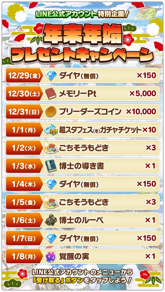 さらに、年末年始は8日間毎日10連ガチャが1回無料で引けるイベントや、お年玉プレゼントキャンペーン、デイリーミッションをコンプリートすると豪華アイテムがもらえるキャンペーンも開催されます。